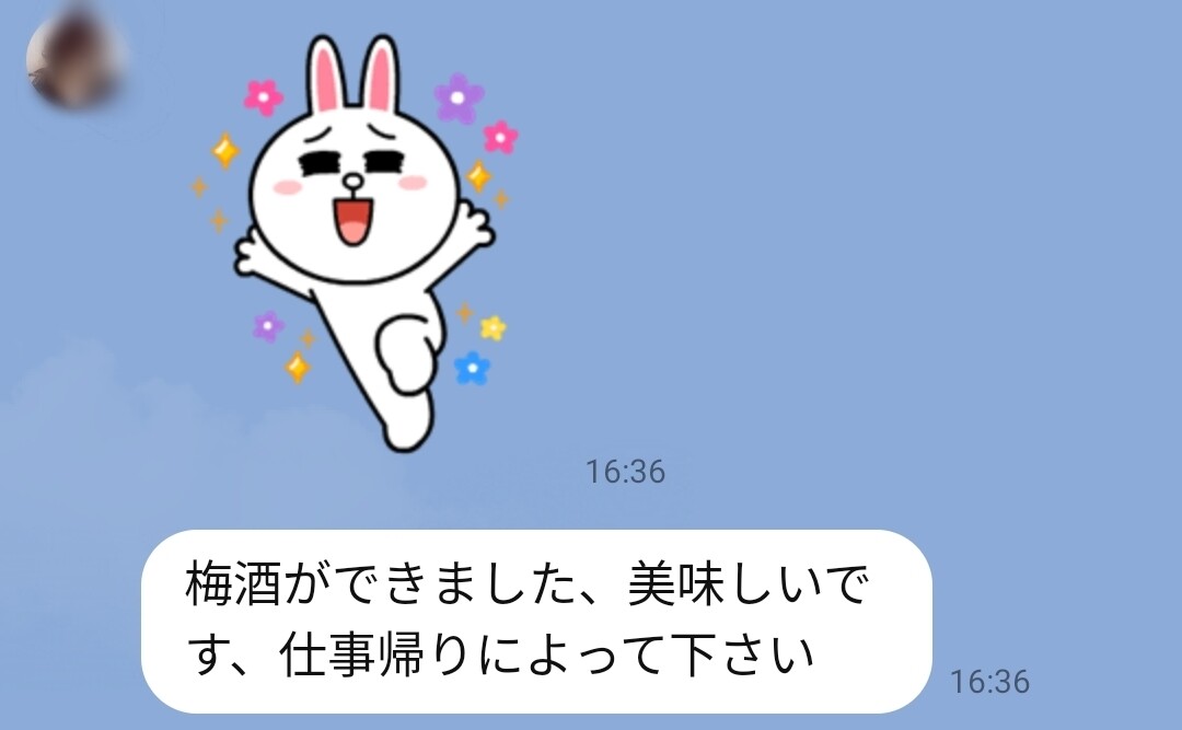 「梅酒ができたから、仕事帰りに寄ってね」とLINEが届きました。