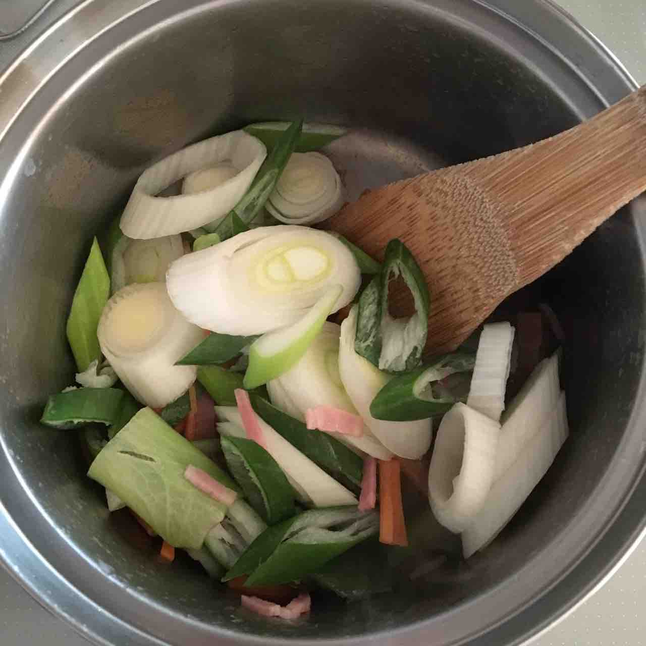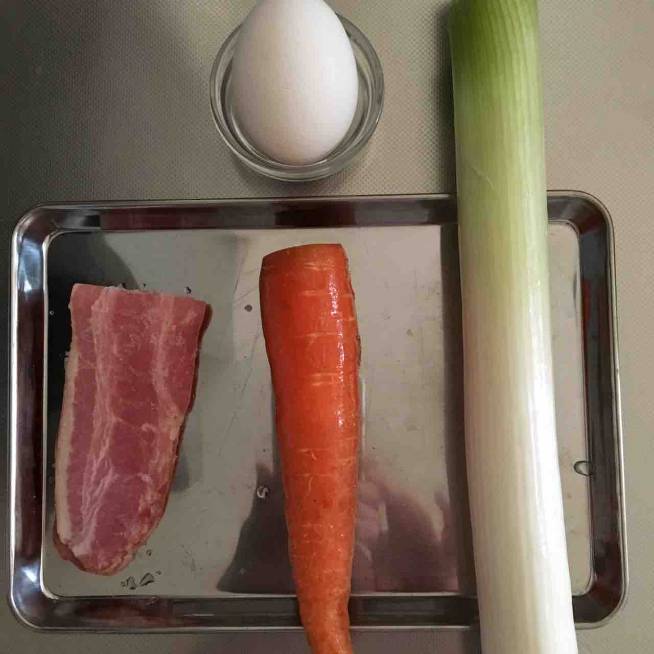 白ネギは斜め薄切り、人参とベーコンは細切りにする。卵は溶いておく。