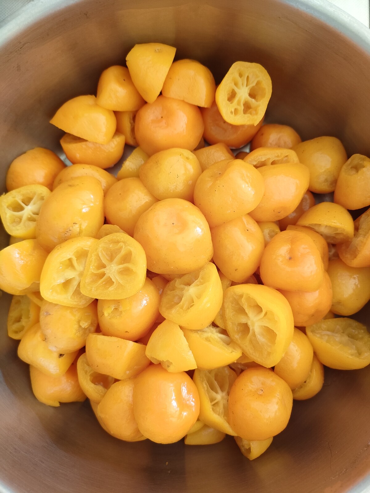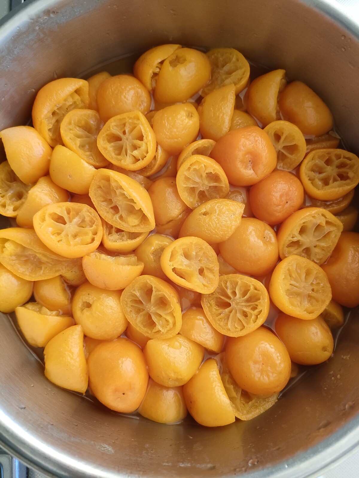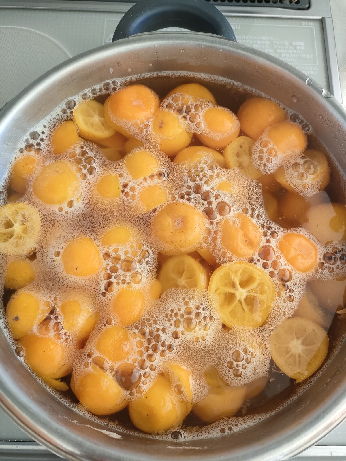 鍋に金柑を戻し入れ一度茹でこぼして~