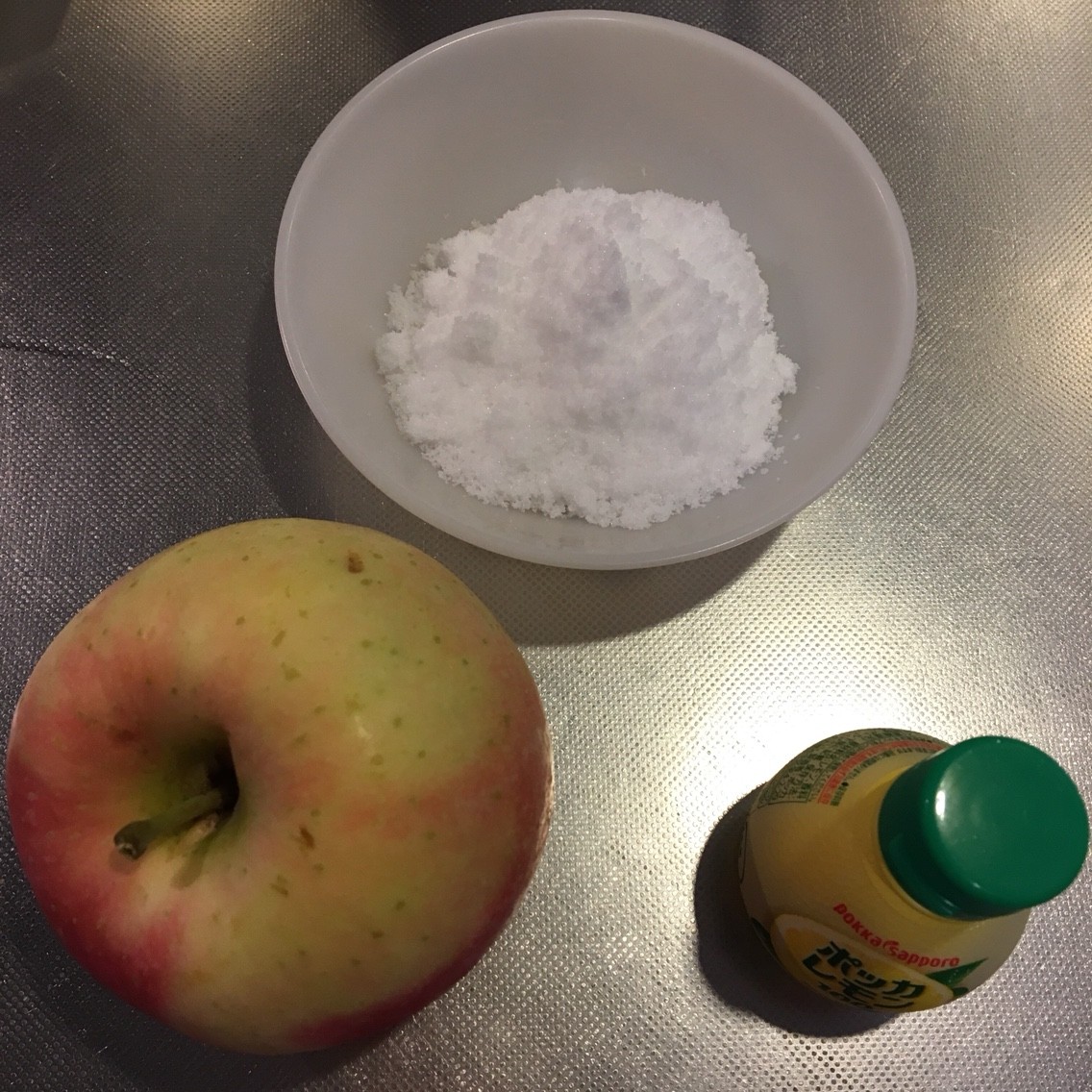 リンゴは皮を剥いていちょう切りにし、鍋に入れて砂糖とレモン汁を上からかけます。