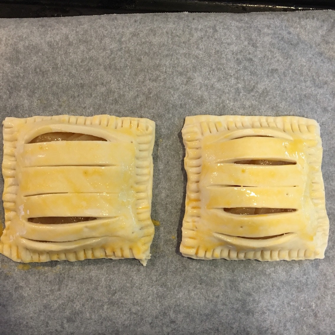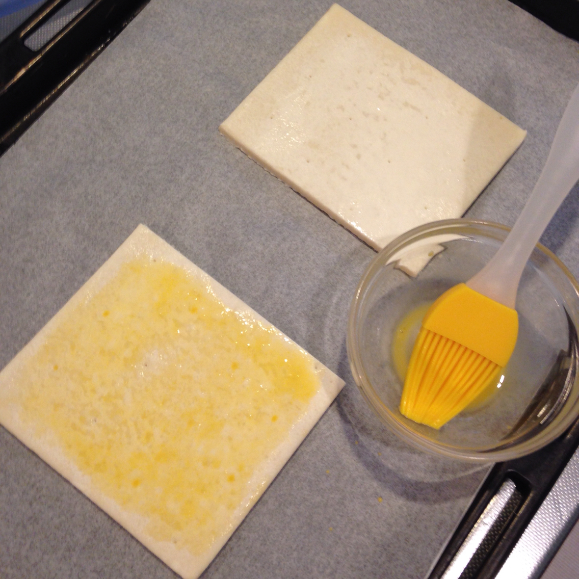 卵液がパイシートのカット面に付くと膨らみにくくなるので、なるべくカット面には卵液を塗り込まないようにしてくださいね。