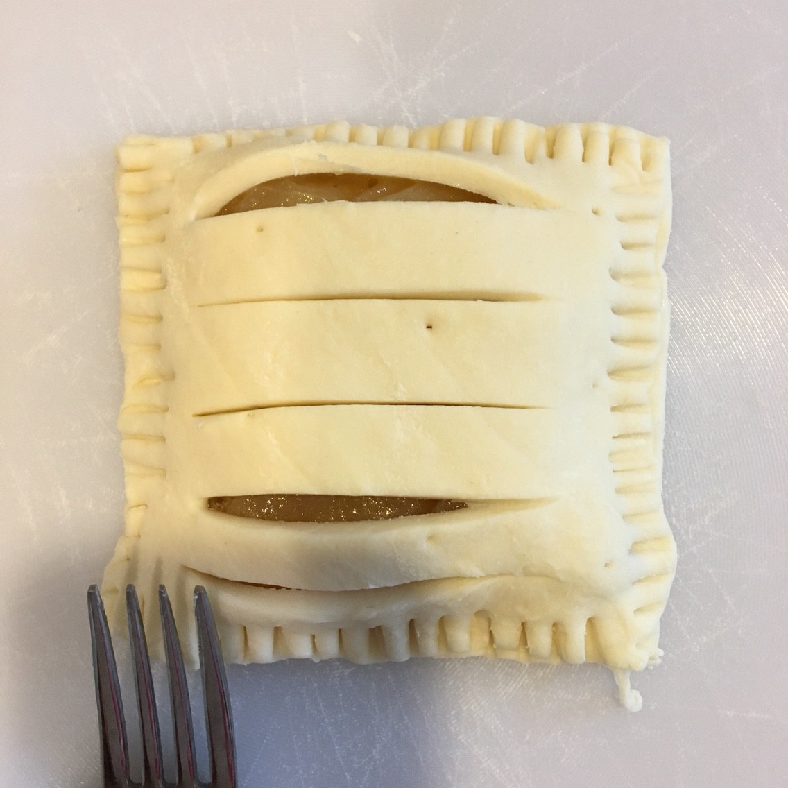 上からパイシートをかぶせ、端をフォークで押さえていきます