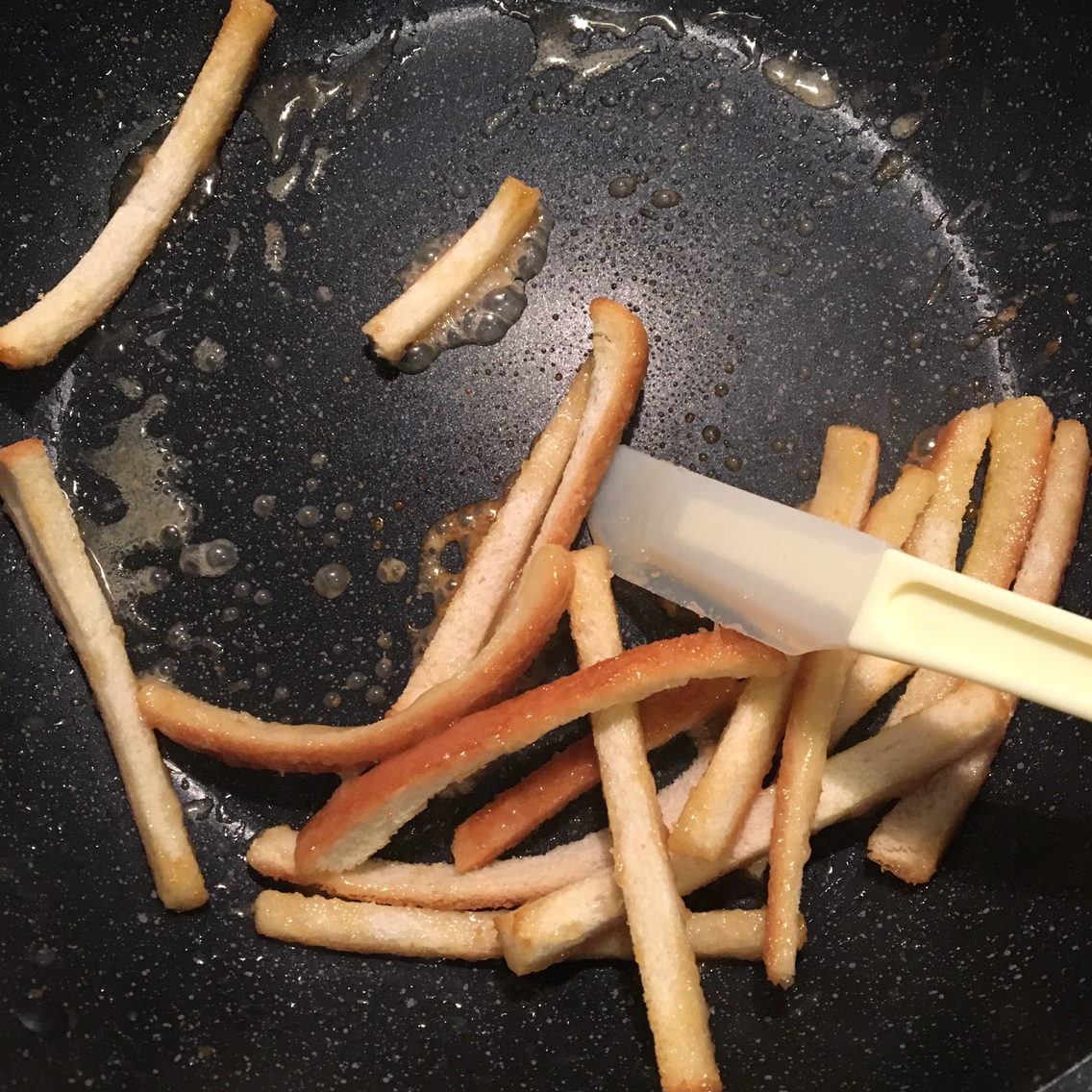フライパンにバター15g、ハチミツ大匙1を熱し焼いたパンの耳を半量絡めます