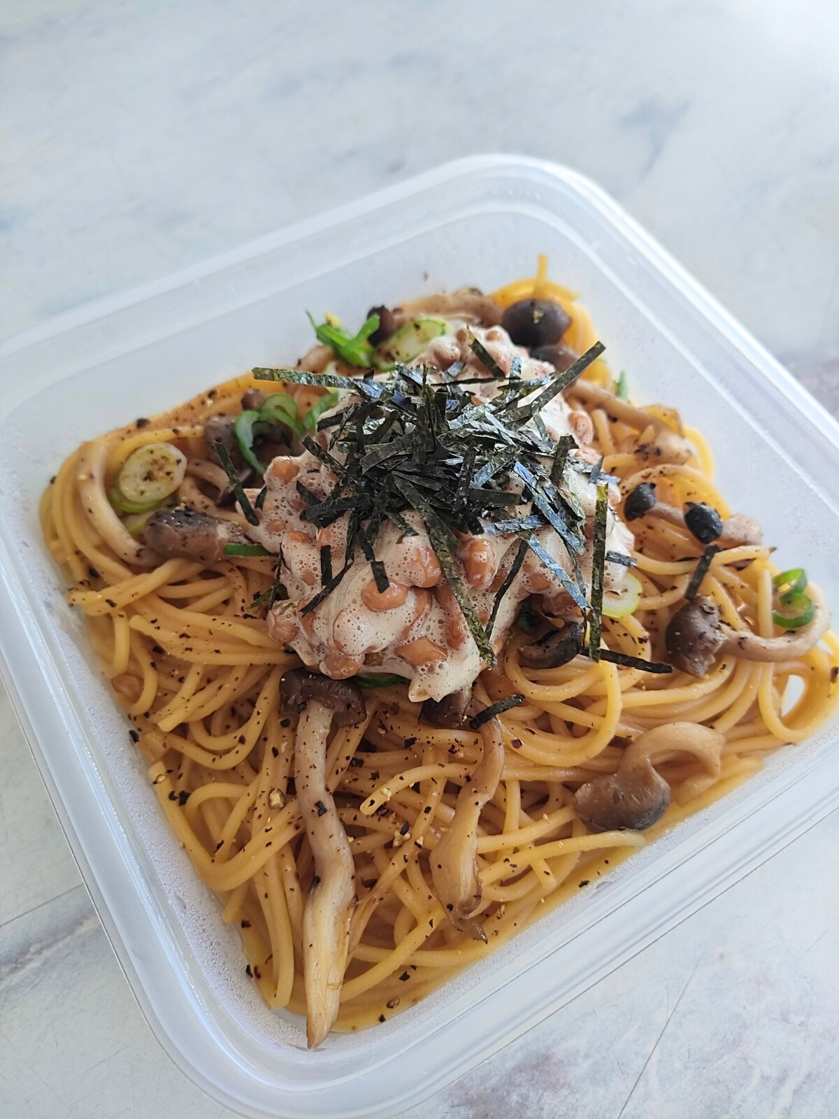 会社でレンチンしたパスタに、ふんわり泡立つ納豆をトッピングしました