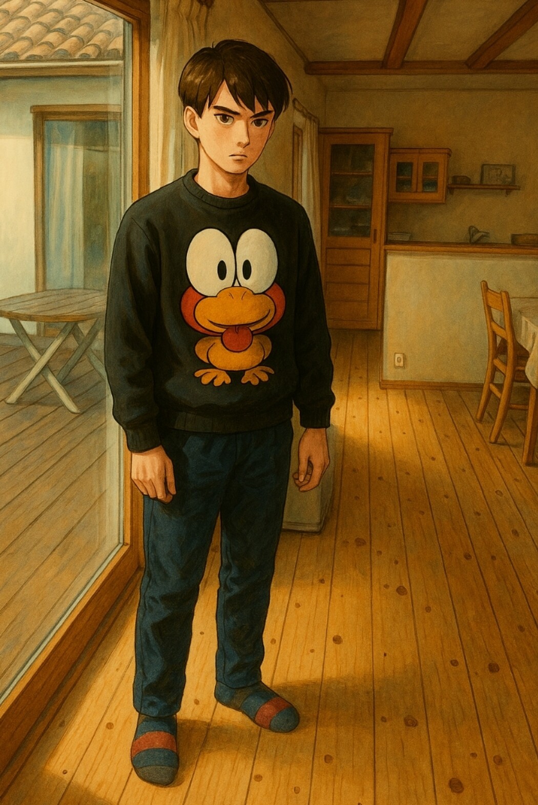 ど根性ガエルのトレーナーを着てますが、ぴょん吉をジブリ風にすると微妙だわ~