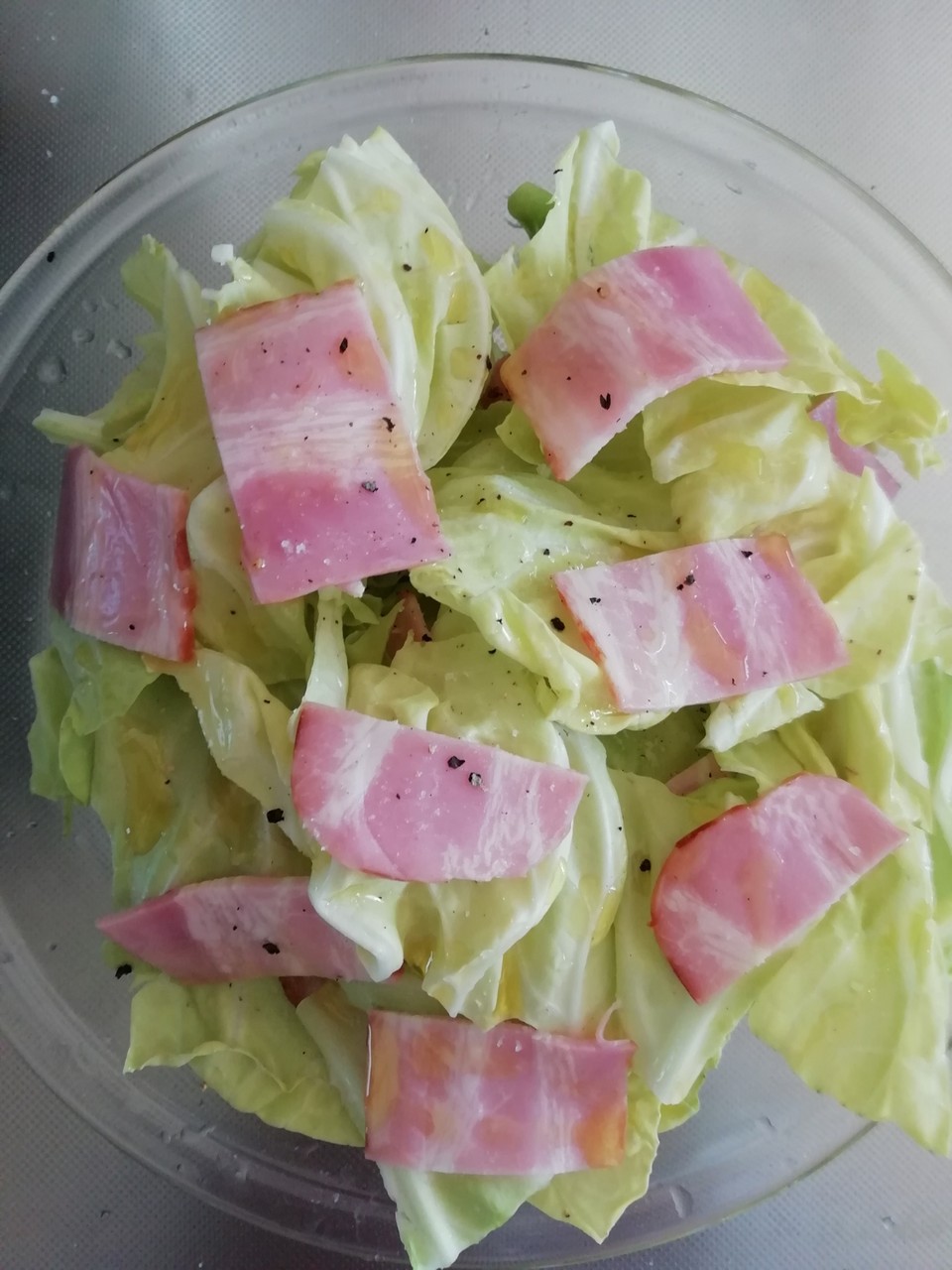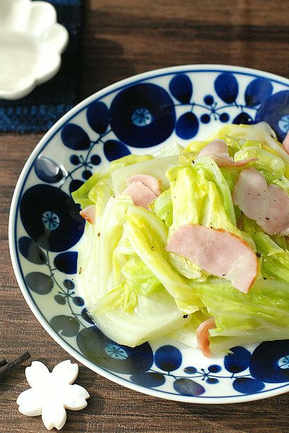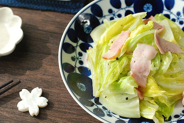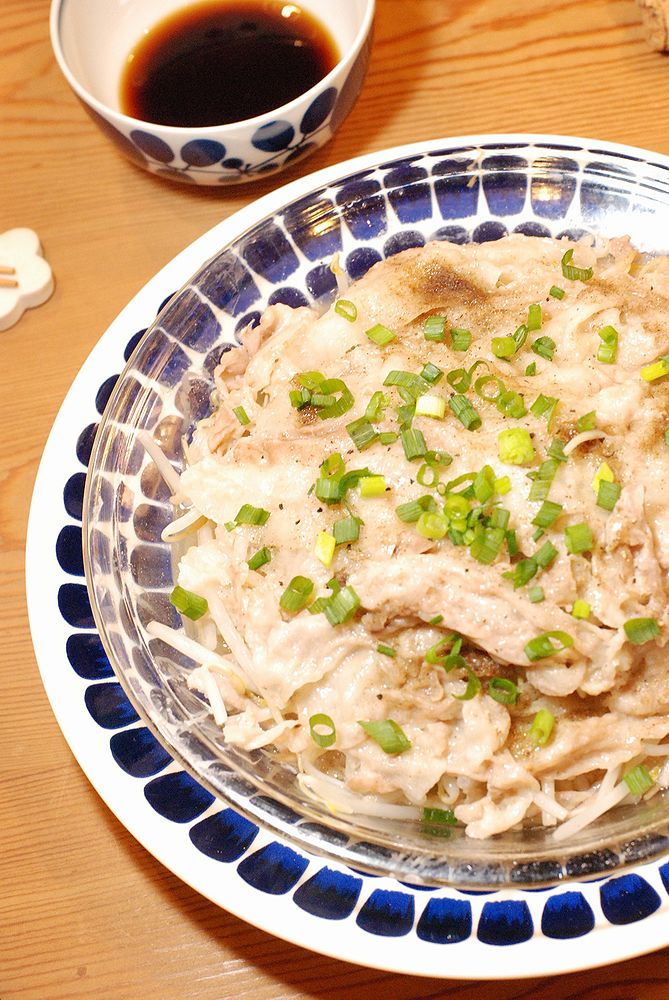 もやしと豚バラしゃぶしゃぶ用のお肉を順に重ね塩コショウ、ほんだし、酒を振って3分レンチンしたらかんせい!